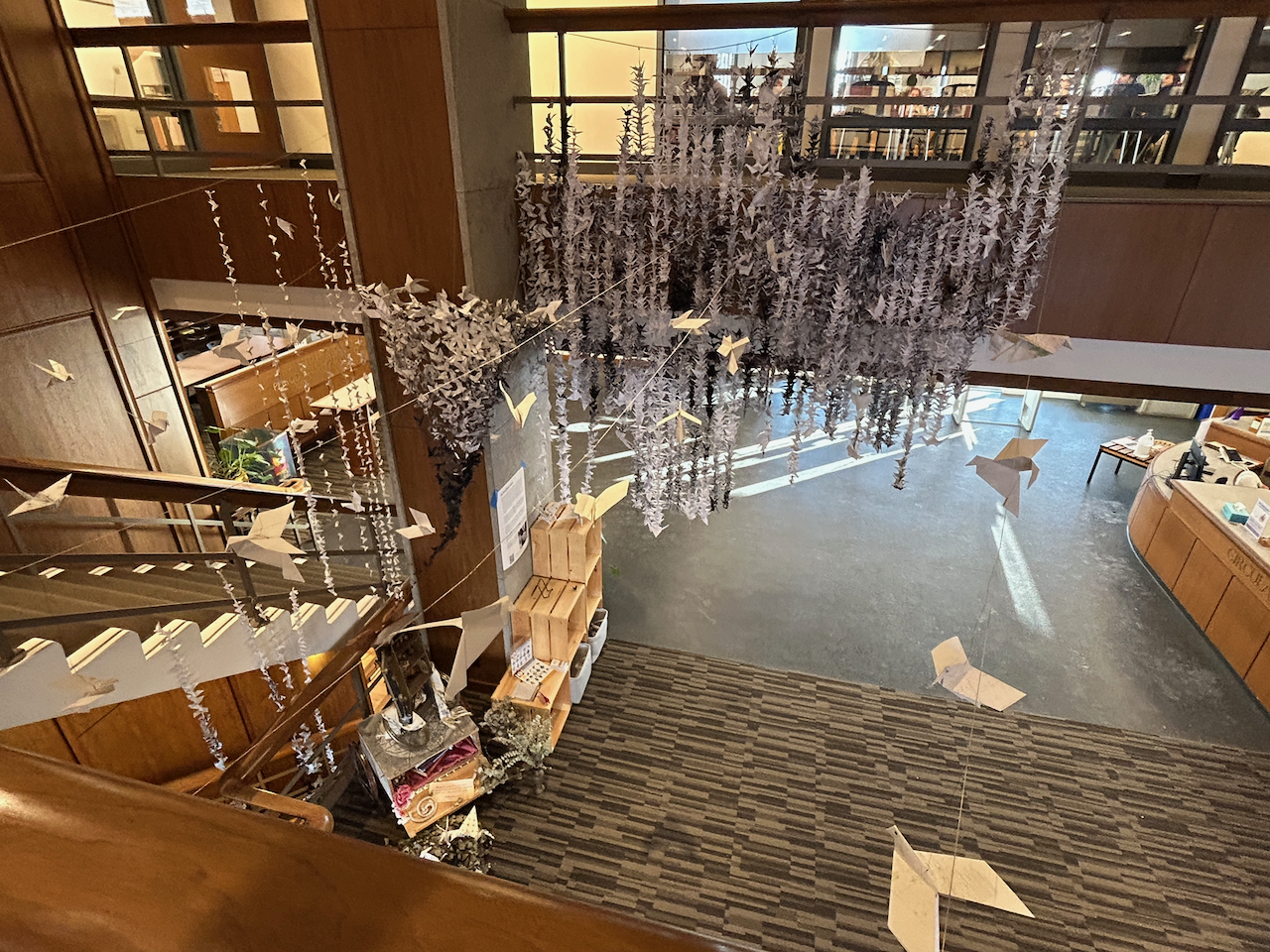 We are so honored to have the opportunity to exhibit the PeaceBirds at Amherst College. The opening reception on February 16 was moving and awe-inspiring. We’ve been hosting folding events in the Frost Library as well as the Science Center. The installation will close June 1, so there’s still time to visit and see how it’s growing. You can join us at our final folding event on May 22 at 3:00-6:00 pm.